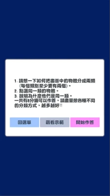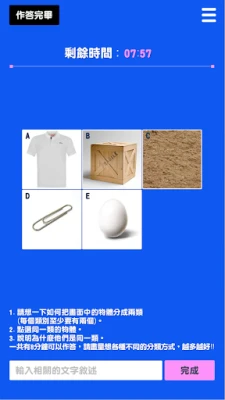 Assessing Creativity 是一款創造力評量的APP,包含一筆劃遊戲、屬性聯想遊戲、簡圖聯想遊戲、圖繪展開遊戲等四項遊戲內容,經由使用者可在遊戲歷程的圖像或文字作答中,亦可以進一步的分析出精緻性創意或創新性思考力表現,同時所有作答資料亦受到使用者隱私保護。另外,此平台會自動過濾掉不雅、暴力與性暗示的作答文字。