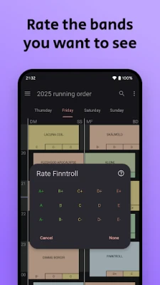 Rate the bands you want to see to get a custom running order, and share those ratings with the friends who'll be with you.