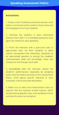 The aim of this Speaking Assessment App is to help English teachers with their speaking and oral evaluations through technology and the use of rubrics.